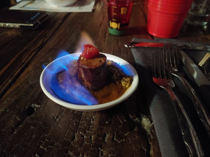 Highlights of these meals included preparations such as a cured baby back rib, a Denver steak carpaccio, a homemade beef tenderloin hot dog, wild boar andouille, and a prawn ceviche inside a gyoza dumpling. Sides and accompaniments were no less impressive, featuring techniques as well as ingredients like cured egg yolk, purple Peruvian horseradish mashed potatoes, smoked tomato molasses, homemade farfalle pasta, and pickled enoki mushrooms.